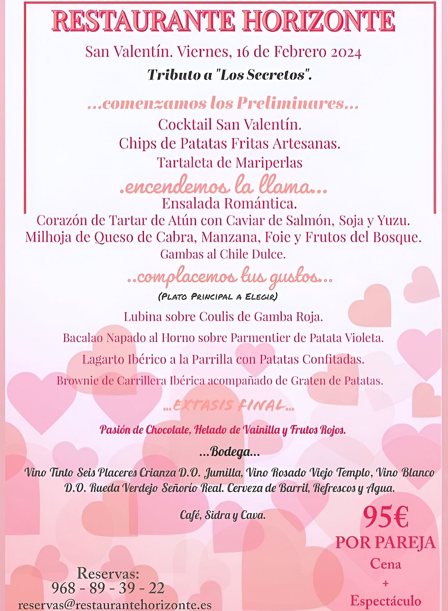 El Restaurante Horizonte, celebrará este San Valentín una cena romántica al ritmo de los temazos que nos han acompañado en nuestra vida. Un tributo a la banda Los Secretos, de la mano de Fito Galiana (guitarrista de Los Secretos y Sureya, interpretando temas de amor del mítico grupo español mientras degustáis un delicioso menú. Platos llenos de sabor mediterráneo acompañados de un gran repertorio de letras pegadizas que harán más especial esta cena para dos.